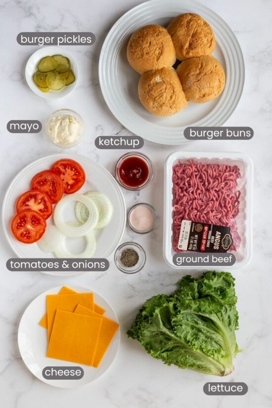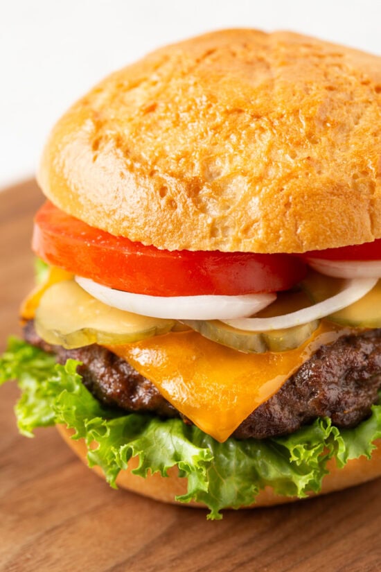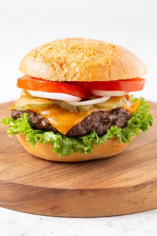 - Classic Cheeseburger – toast your burger bun first for best results! Then add your toppings of choice which for this version include sliced cheese, hamburger pickles, sliced tomato, a few slices of onion, lettuce, and ketchup or mayonnaise.
