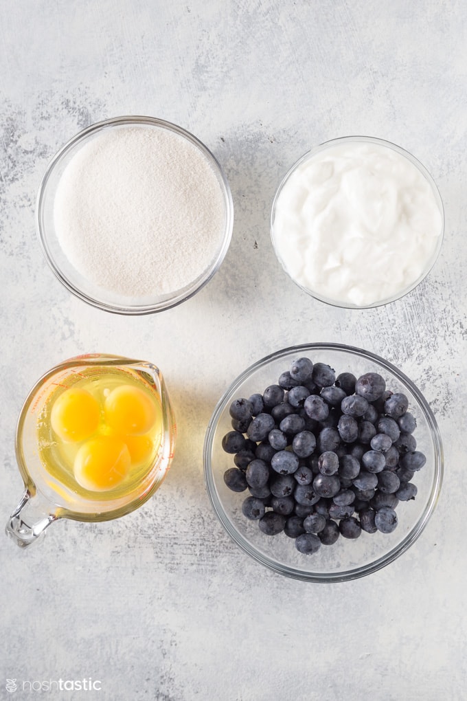 Start by measuring out all your ingredients. In the two photos below you can see the low carb powdered sugar, yoghurt, eggs, blueberries, almond flour, lemon zest, vanilla extract, butter, salt, and baking powder.