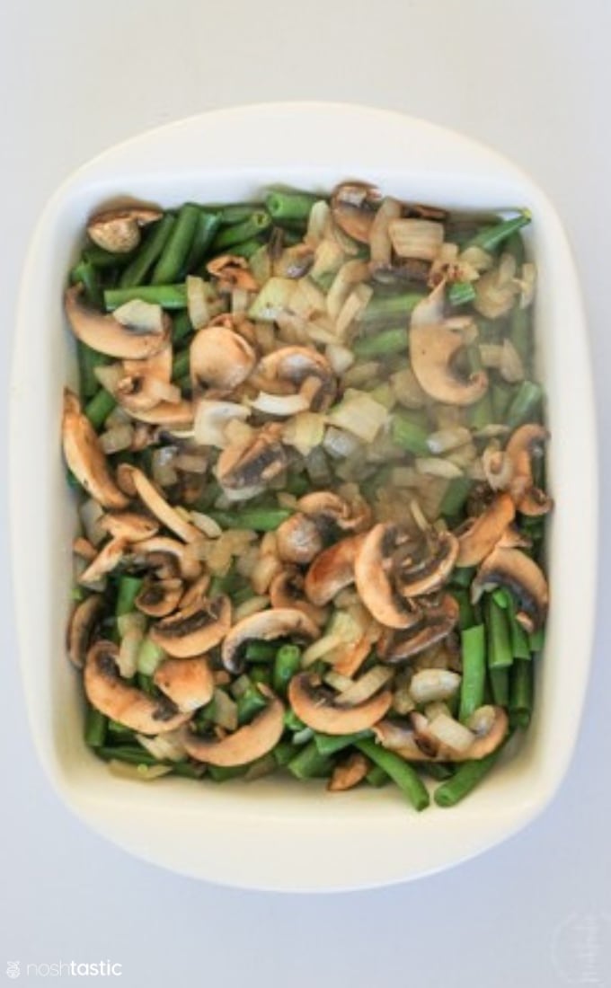 Step 4 – Assemble the green beans onions and mushrooms into the casserole dish