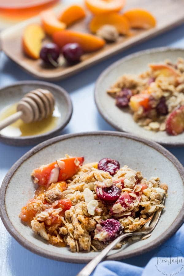My family love this easy Gluten Free Peach Crisp with Cherries recipe! It’s got a lovely healthy topping made with oats and almond flour so you could easily have it for breakfast, or for dessert with ice cream.