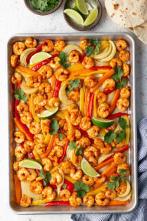 This sheet pan shrimp fajitas recipe is a quick, straightforward dinner made with shrimp, bell peppers, and onion, all roasted together on one pan. The homemade fajita seasoning keeps the flavors balanced without overpowering the shrimp, and the method keeps everything tender and evenly cooked.