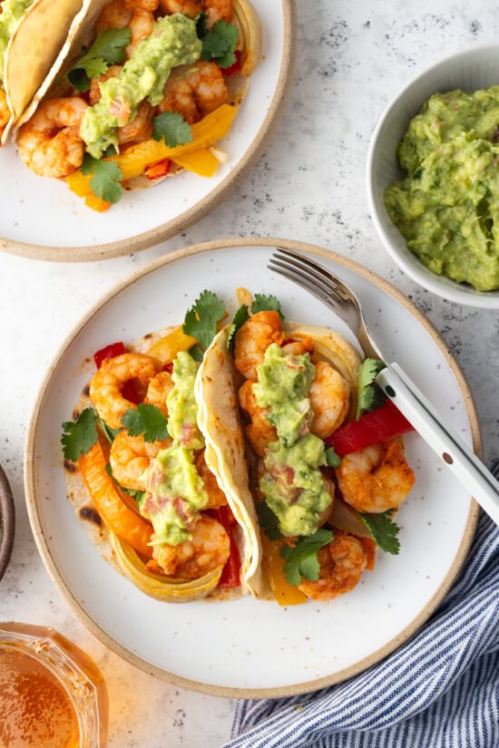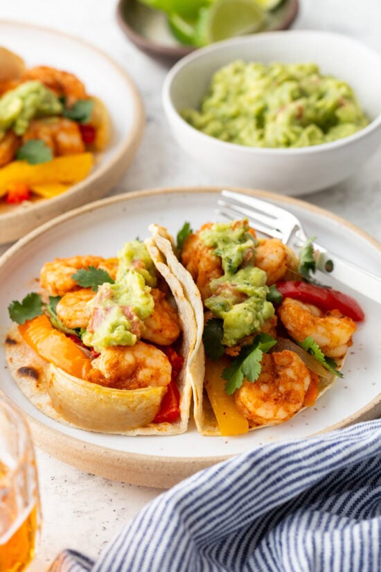 Serve these shrimp fajitas with warm corn tortillas or gluten-free tortillas, guacamole, fresh lime wedges, and chopped cilantro. The acidity from the lime balances the spices and adds a little ‘zing’ to the chicken, while the guacamole adds creaminess.